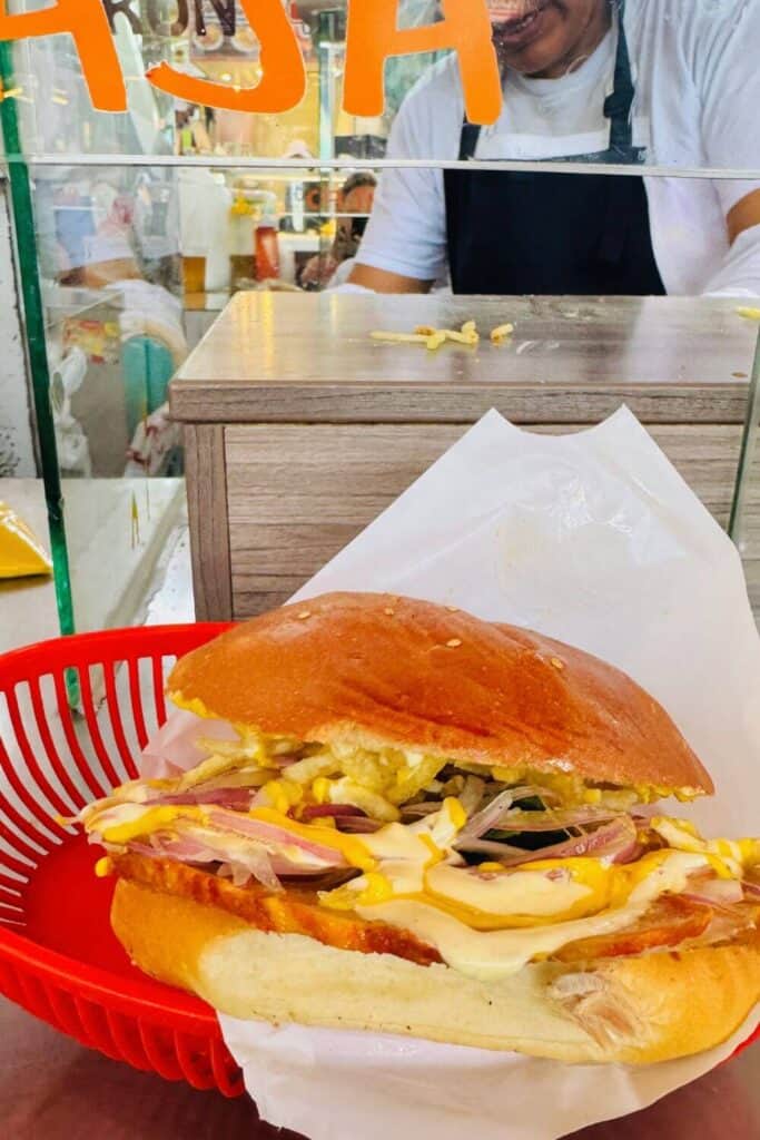 • Lechon Sandwich mit Sweet Potato Chips, Zwiebeln & Senf
